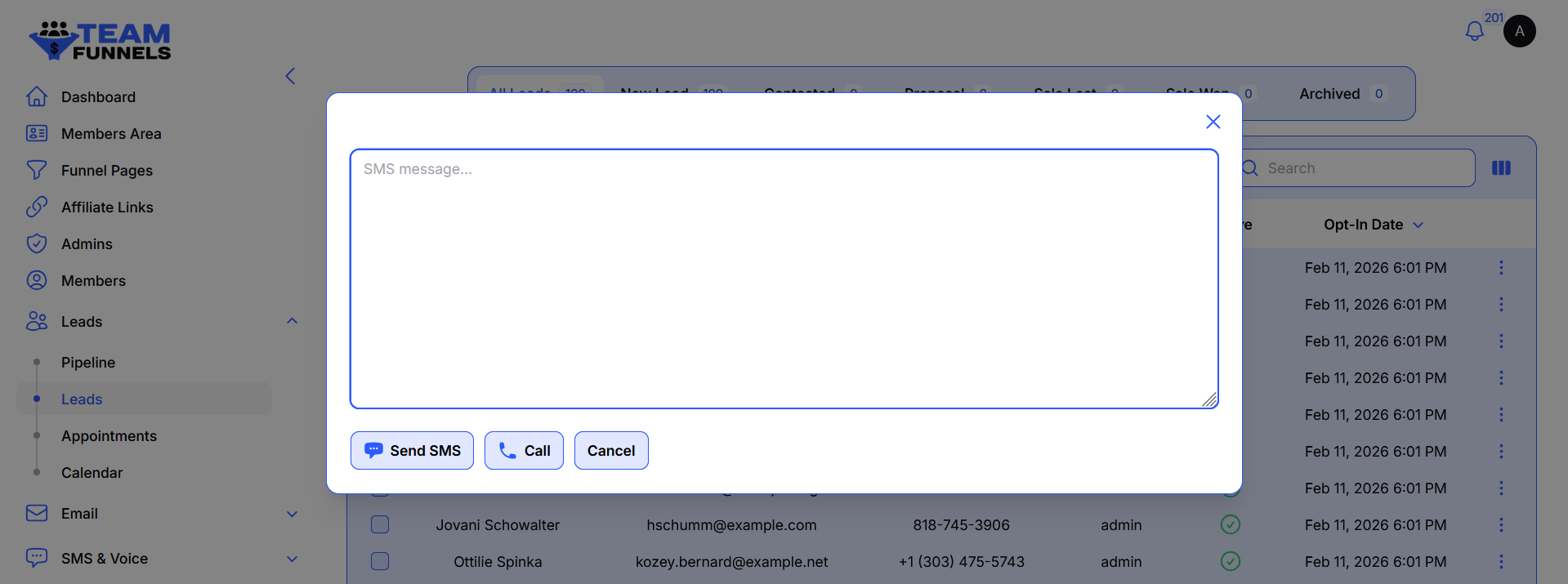 Every member can send SMS messages to their leads and make direct calls. They can also select multiple leads to send bulk SMS messages. You can write a sequence of SMS autoresponders to be sent to all leads at specific intervals. The SMS messages and voice calls are processed directly with Twilio or Vonage. Each of your members can enter their own Twilio or Vonage API keys. There is no middle man mark up, so you get the best possible pricing.